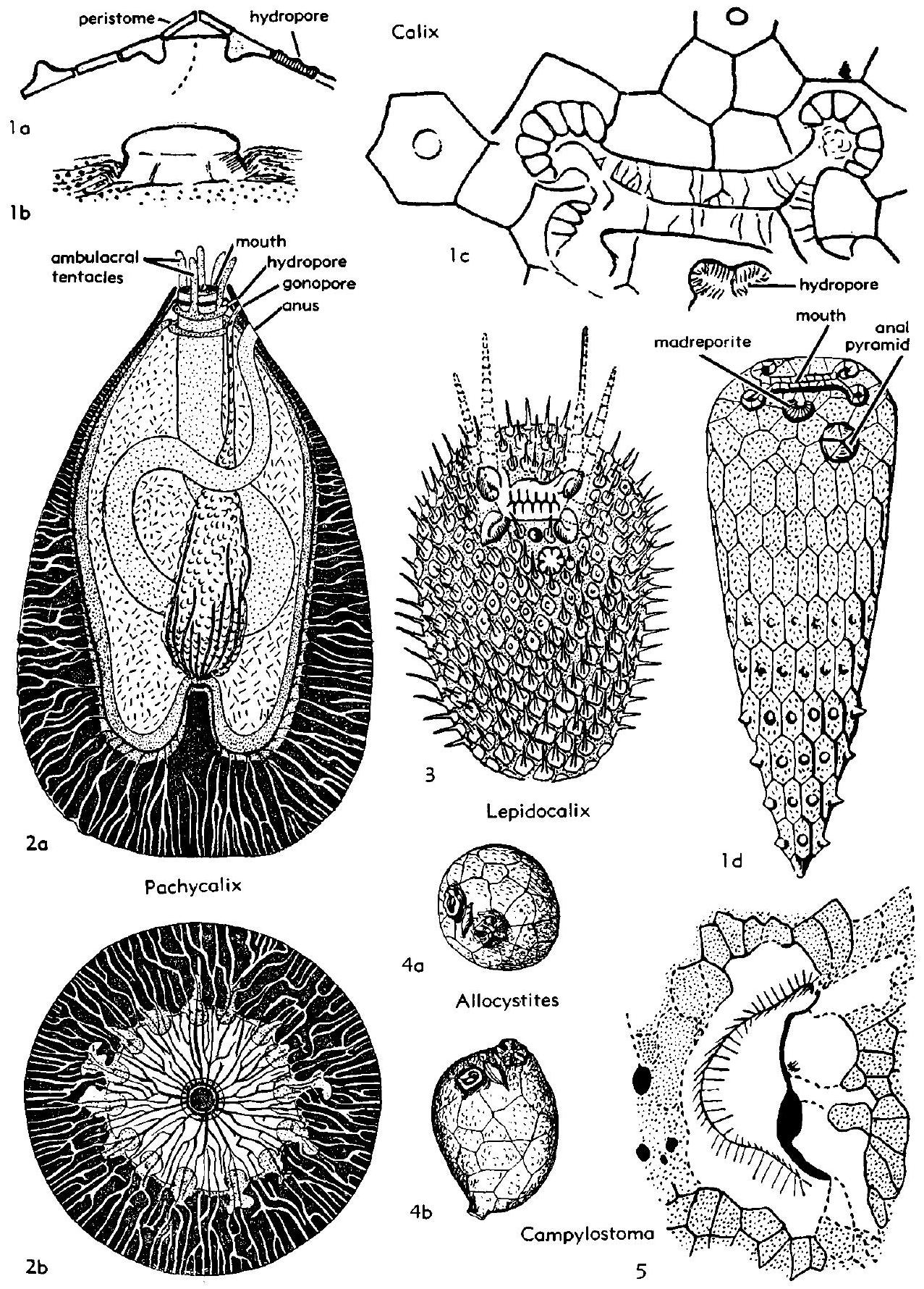 Fig. 143,1. *C. sedgwicki, M. Ord., Fr., 1a, section through peristome and hydropore; 1b, internal mold of peristome; 1c, diagram of oral region (34), 1d, reconstr., about X0.2 (128).