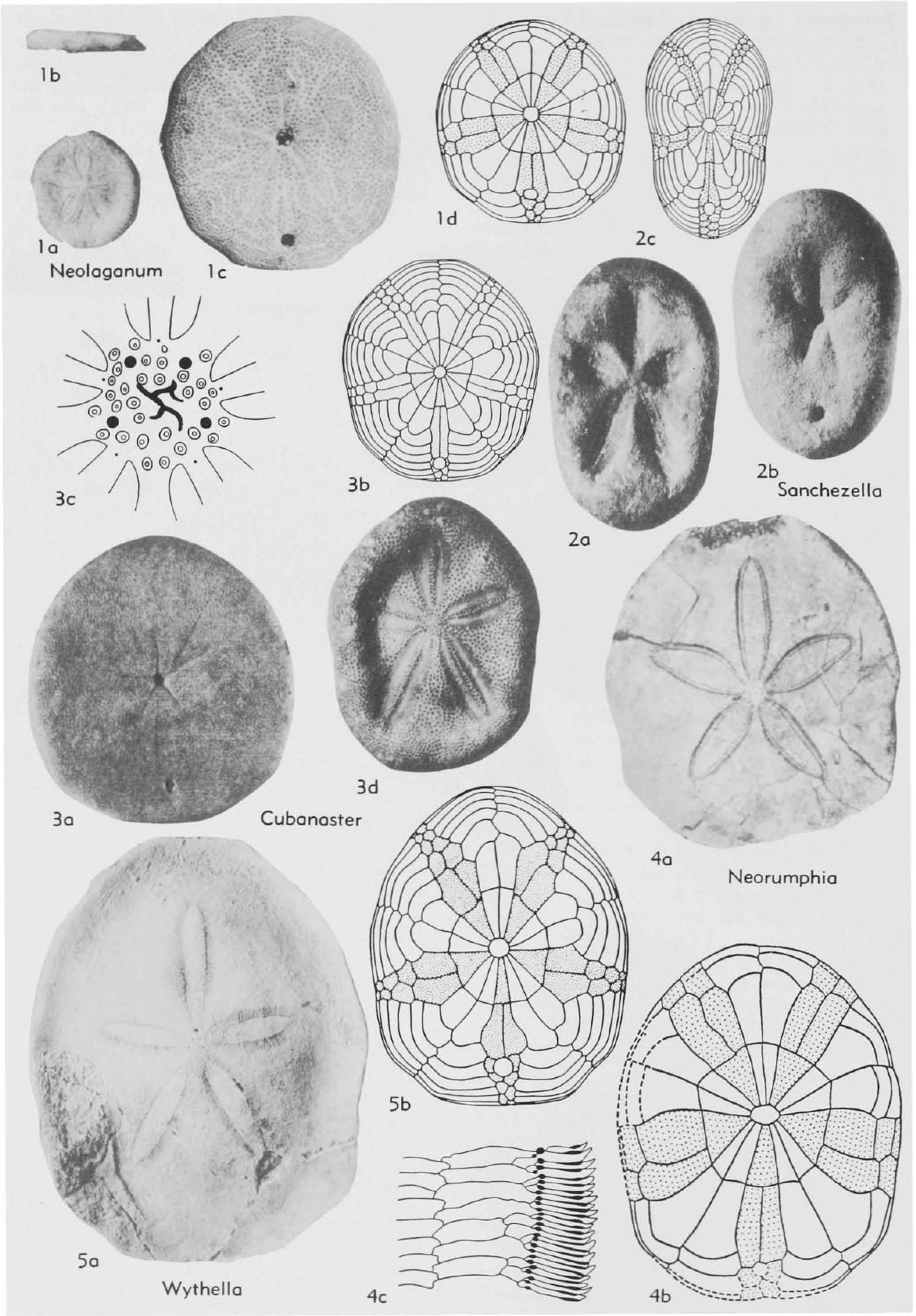 Fig. 365, 3a-c. * C. torrei (Lambert), Cuba, 3a,b, oral, plates of oral surface (interamb. stippled), X1, 3c, apical system with groove for hydropores, X10 (51, 216d). -- Fig. 365,3d. C. acunai (Sánchez Roig), Cuba, aboral, X0.8 (167)