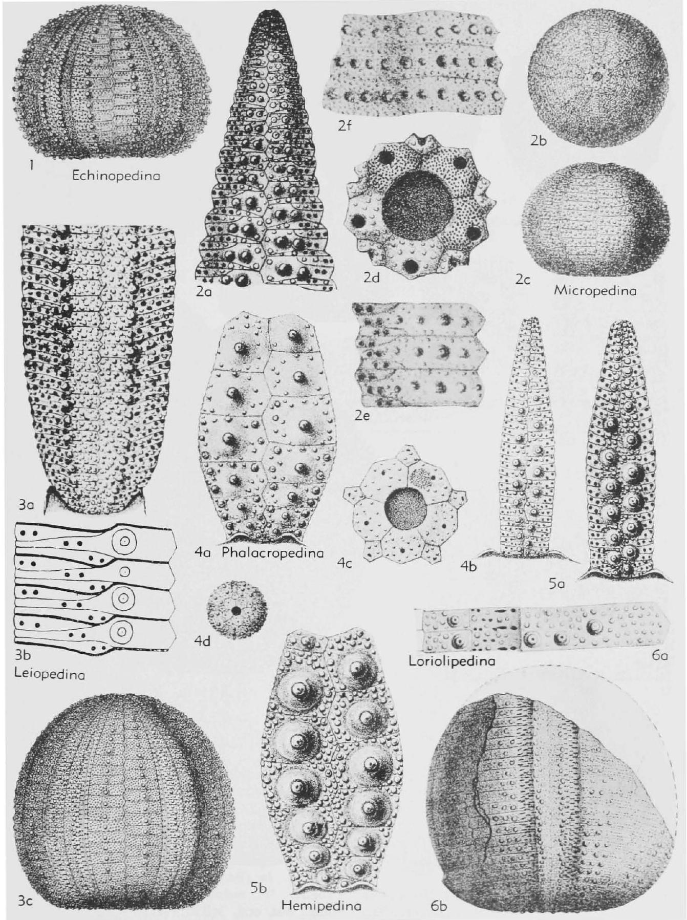 Test small to medium-sized (25-40 mm.), subglobular to sub- conical. Pore pairs arranged in arcs of 3, of which adapical pair lies outermost (inverse). Numerous enlarged tubercles in both ambs and interambs, forming many series. Peristome small. Spines slen- der, longitudinally striate.
