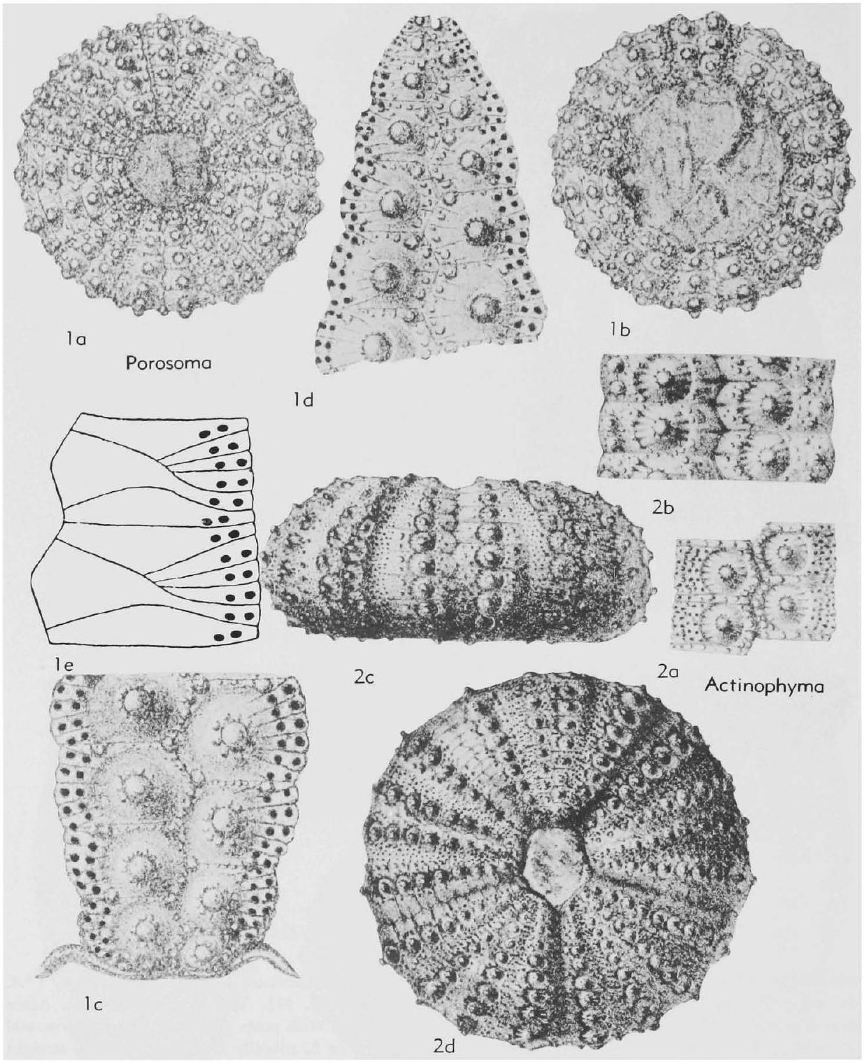 Fig. 295,1a-c. *P. cribrum (Agassiz), Eoc., Fr., 1a,b, test, aboral, oral, X1 (27e), 1c, adoral part of amb, X2.7(27e)